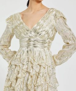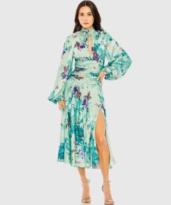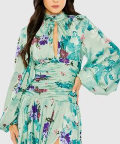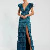 Mac Duggal Women’s Dresses Pink Drawstring Shoulder Chiffon Tiered Floral Dress | Pink