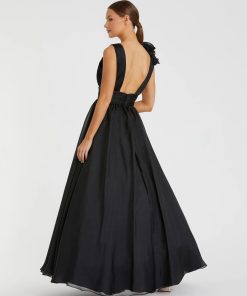 V-neck sleeveless ball gown with ruffled shoulder ruched empire waist and ruffles flowing down the skirt.
