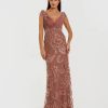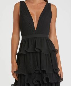 This elegant gown features a plunging V-neckline and a sleeveless design, creating a sleek and sophisticated look. The ruffle tiered skirt adds a touch of femininity and movement, making it perfect for any formal event.