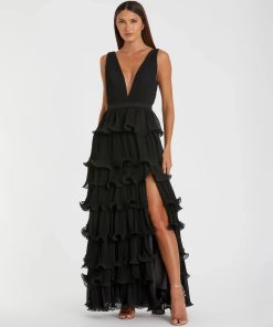 This elegant gown features a plunging V-neckline and a sleeveless design, creating a sleek and sophisticated look. The ruffle tiered skirt adds a touch of femininity and movement, making it perfect for any formal event.