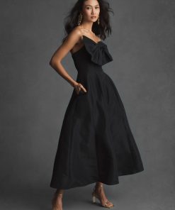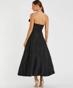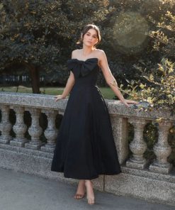 This elegant statement dress exudes classic 50s style with its strapless A-line silhouette and tea length skirt. The flattering design is perfect for special occasions and the bow detail adds a charming touch. Feel confident and beautiful in this timeless dress. Perfect for parties, a special dinner or event.