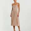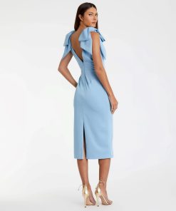 This elegant crepe dress offers a sleek, flattering fit with a v-neckline, sleeveless design, and eye-catching bow shoulder detailing for added feminine charm.