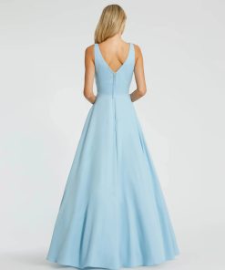 Perfectly tailored classic sleeveless ball gown with a v-neckline, fitted bodice. The full a-line skirt is layered with tulle for added structure. The full skirt of this gown features pockets.