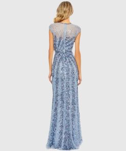 This hand-embellished dress showcases shimmering sequins and intricate beading. Featuring an illusion sweetheart neckline, cap sleeves, and a thigh-high slit, it’s a sophisticated choice for special occasions.