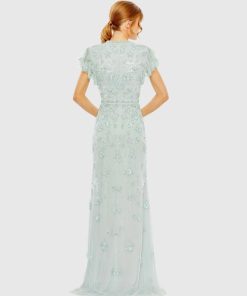 This elegant gown features a high neckline and short flutter sleeves for a sophisticated silhouette. The embellished mesh fabric, adorned with delicate floral embellishments, adds a touch of glamour, making it perfect for special occasions and a stunning addition to your wardrobe.