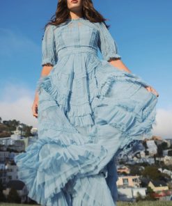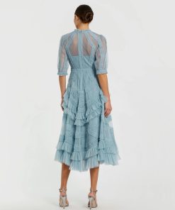 An a-line midi dress with a high neckline, 3/4 sleeves, and tiered ruffles for a graceful, modern silhouette. Perfect for garden parties, brunches, and daytime events.