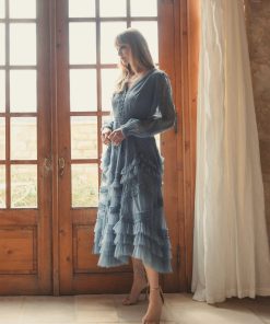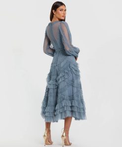 Be the first to review “Mac Duggal Women’s Dresses Blue Long Sleeve V-neck Micro Ruffle Midi Dress | Slate Blue” Cancel reply