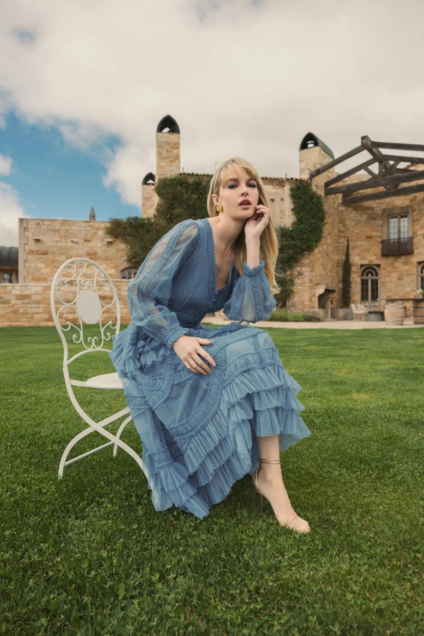 Mac Duggal Women’s Dresses Blue Long Sleeve V-neck Micro Ruffle Midi Dress | Slate Blue