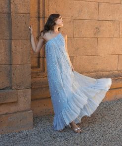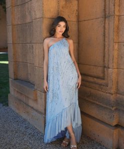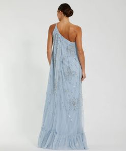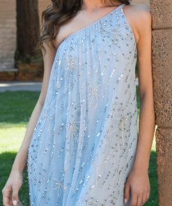 This stunning gown features intricate beaded and sequin detailing, a one shoulder neckline, and a subtle high low hem. The beaded bow embellishments add a unique and glamorous touch, making it the perfect gown for any special occasion.