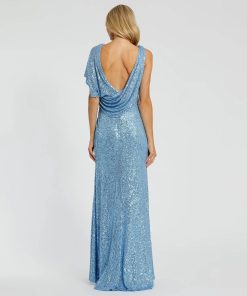 Draped sequin gown with ruched detailing, cape sleeve, and a thigh-high slit.