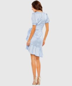 Perfect for any daytime occasion, this mini dress feature short puff sleeves and a charming asymmetrical ruffle hem.