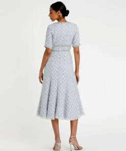 This charming dress is crafted from boucle fabric, offering a textured and sophisticated look. The flattering A-line silhouette, paired with a high neckline and short sleeves, creates a timeless, elegant style. Beaded pearl waist and trim details add a touch of refinement, while the frill detailing adds a playful touch. Perfect for daytime events, brunches, or casual outings, this dress effortlessly combines elegance with modern flair, making it a versatile addition to your wardrobe.