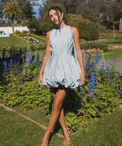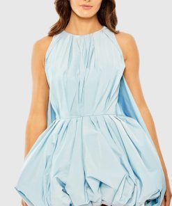 This fun and flirty blue taffeta bubble mini dress features a flattering silhouette and delicate cape back, creating the perfect blend of playful elegance and bold drama—perfect for your next daytime date or special occasion.