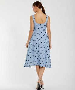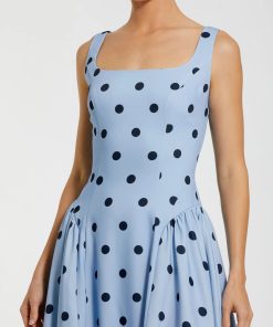 Mac Duggal Women’s Dresses Blue Square Neck Crepe Polka Dot Fit And Flare Midi Dress | Sky Multi