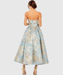 Timeless and elegant, this gorgeous floral midi dress is the perfect look for any special occasion. Crafted from beautiful floral-printed brocade fabric, it features a strapless neckline and side pockets.