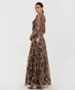 Mac Duggal Women’s Dresses Brown Embellished Long Sleeve High Neck Evening Gown | Bronze