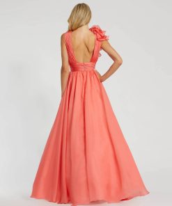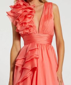 V-neck sleeveless ball gown with ruffled shoulder ruched empire waist and ruffles flowing down the skirt.