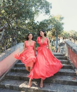 V-neck sleeveless ball gown with ruffled shoulder ruched empire waist and ruffles flowing down the skirt.