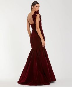 Sophisticated and striking, this velvet gown features a one-shoulder neckline with dimensional floral appliqué. The curve-hugging silhouette flares into a dramatic trumpet hem, perfect for black-tie events and formal evenings.
