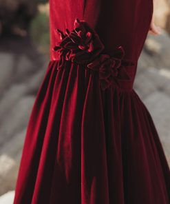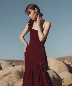 - 3D velvet floral appliqués at shoulder and hip with gathered detailing