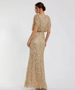 Sequin gown with v-neckline, ruched detailing, and draped short sleeves.