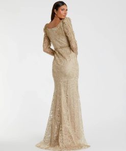 Mac Duggal Women’s Dresses Gold Long Sleeve Embroidered Applique Trumpet Gown | Light Gold