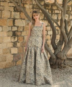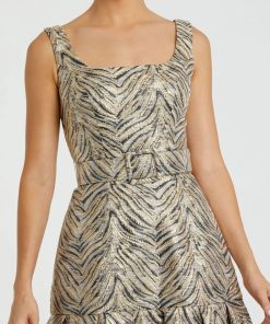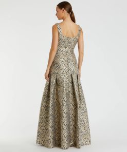 Make a statement in this stunning metallic striped gown. Featuring a modern animal-inspired print, chic square neckline, and elegant box pleats, it’s the perfect blend of contemporary flair and timeless sophistication.