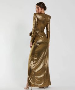 This Metallic Long Sleeve Gown is crafted from shimmering charmeuse fabric, making it perfect for a glamorous event. The long sleeves provide coverage while the thigh high slit adds a touch of sensuality. Finished with a bow detail, this gown exudes elegance and sophistication.