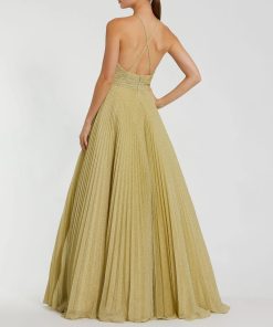 Crafted from shimmering lurex fabric, this stunning ballgown features a high neckline, a flattering pleated waistband, and a strappy open-back. Perfect for weddings, evening events, or any special occasion, you’re sure to shine in this gown.