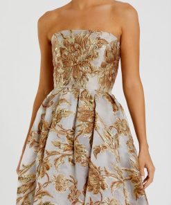 Indulge in luxury in this glamourous brocade midi dress. Featuring a sophisticated strapless neckline, sleeveless design, and pockets, it’s the perfect dress for any special occasion.