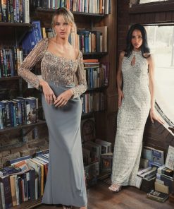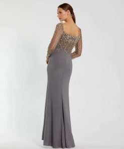Dazzle in our Beaded Square Neck Long Sleeve Jersey Gown. Featuring intricate beadwork and a flattering square neckline, this gown is perfect for formal events. The long embellished sleeves add a touch of elegance, making it an ideal choice for a stunning and stylish look.