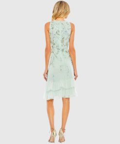 Adorned with allover floral embellishments, this above-the-knee floral dress features a high neckline and ruffle tiered fabric.