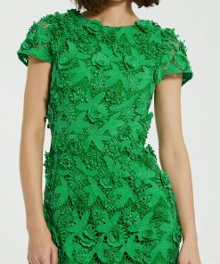Mac Duggal Women’s Dresses Green Floral Lace Fitted Short Sleeve Midi Dress