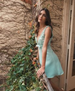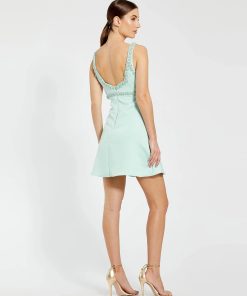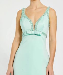 This Hand Beaded Detail A-Line Mini Dress features a deep plunge neckline, intricate beaded embellishments, and a center bow detail. Perfect for a sophisticated and stylish look, this dress will make you stand out at any event.
