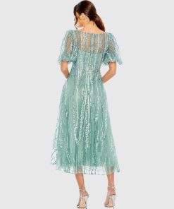 This stunning embellished midi dress features a high neckline, short flutter sleeves, and a flattering A-line silhouette. The perfect combination of elegance and charm, making it ideal for cocktail parties, evening events, or special occasions.