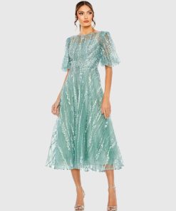 This stunning embellished midi dress features a high neckline, short flutter sleeves, and a flattering A-line silhouette. The perfect combination of elegance and charm, making it ideal for cocktail parties, evening events, or special occasions.