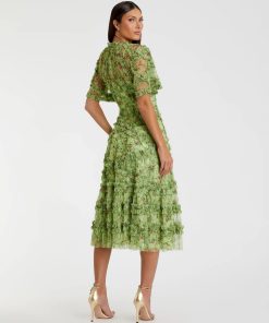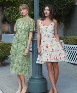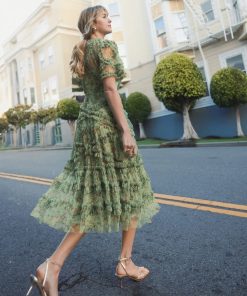 Effortlessly romantic, this flowy floral midi dress features an illusion high neckline, flutter sleeves, and ruffled detailing. Perfect for brunches, garden parties, or daytime celebrations.