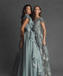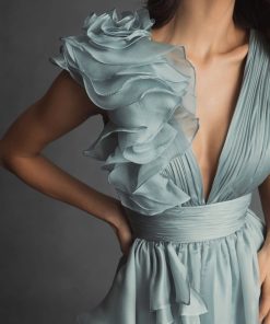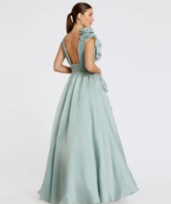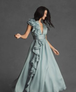 V-neck sleeveless ball gown with ruffled shoulder ruched empire waist and ruffles flowing down the skirt.