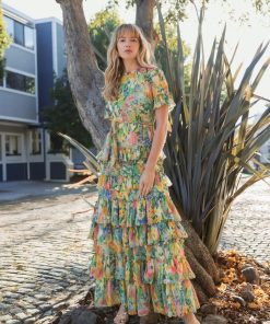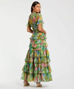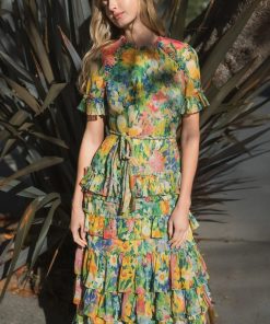 Crafted from flowing chiffon fabric, this stunning floral dress features a high neckline and short ruffled sleeves, with a braided belt that beautifully accentuates the waist. The tiered ruffle skirt adds playful movement and charm, making it the perfect choice for garden parties, weddings, or daytime events.