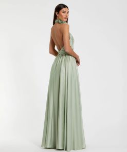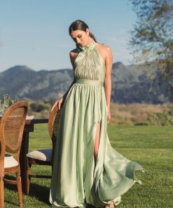 Elegant chiffon gown with a ruched bodice and waistband, an open back, and a rosette halter neckline. The flowing floor-length skirt features a thigh-high slit.