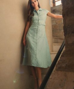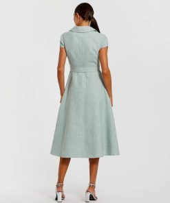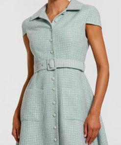 This tailored light blue bouclé dress features delicate pearled button detailing, complemented by a refined midi length and chic cap sleeves. Timeless and elegant, it’s ideal for effortless everyday sophistication.