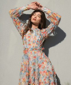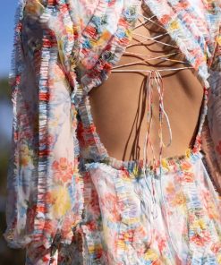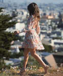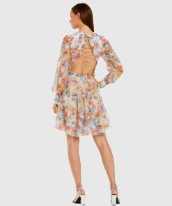 Turn heads in this vibrant floral mini dress with long, romantic puff sleeves, baby ruffles, and a lace-up back, blending elegance and playfulness for luncheons, soirées, and daytime events.