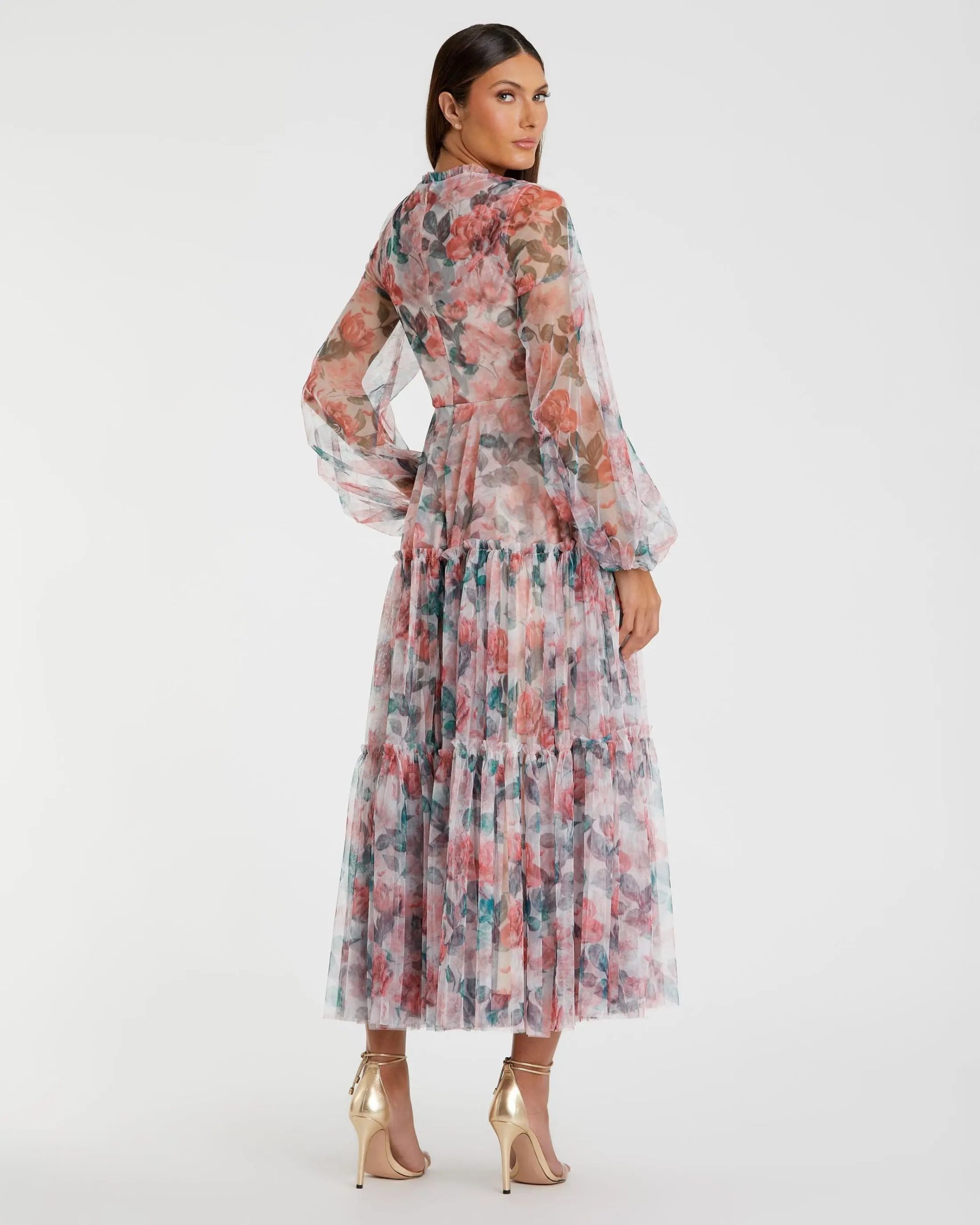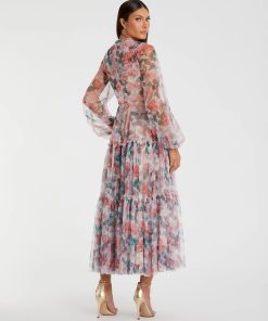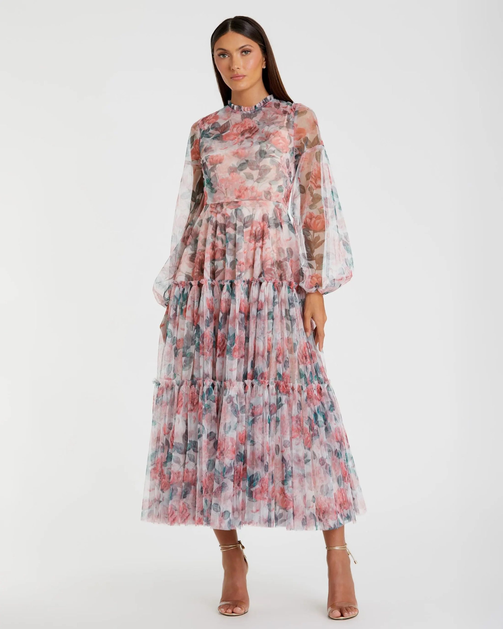 Mac Duggal Women’s Dresses Multicolor Floral High Neck Balloon Sleeve Midi Dress | White Multi