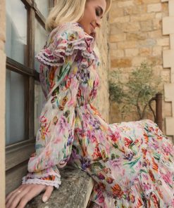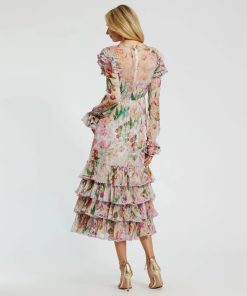 This chic shift dress features ruffled shoulders and sleeve cuffs, while the vibrant floral print and tiered ruffle skirt create a graceful, flirty silhouette that effortlessly blends elegance with playfulness—ideal for brunches, daytime events, or garden parties.