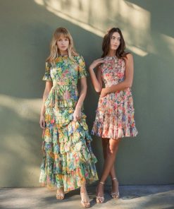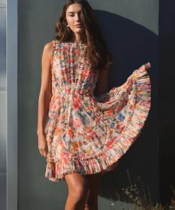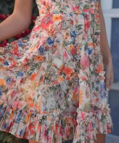 A playful yet elegant mini dress with baby ruffles and a vibrant floral print, perfect for daytime events, brunches, or any occasion to stand out in effortless style.