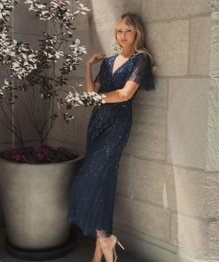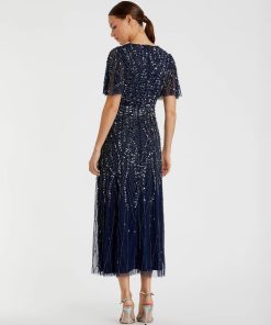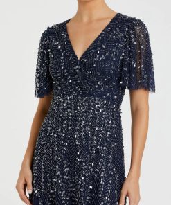 This elegant beaded dress showcases a flattering sheath silhouette, delicate flutter sleeves, and intricate allover embellishments, creating a sophisticated and timeless look. Perfect for any special occasion, it blends glamour with grace.