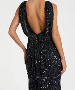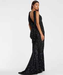 This elegant evening gown features a timeless boat neckline and a flattering trumpet silhouette. The stunning open cowl back adds a touch of glamour and sophistication to your overall look. Perfect for any formal occasion, this gown exudes timeless beauty and style.