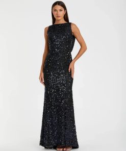 This elegant evening gown features a timeless boat neckline and a flattering trumpet silhouette. The stunning open cowl back adds a touch of glamour and sophistication to your overall look. Perfect for any formal occasion, this gown exudes timeless beauty and style.