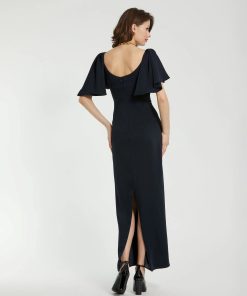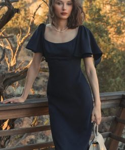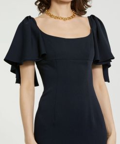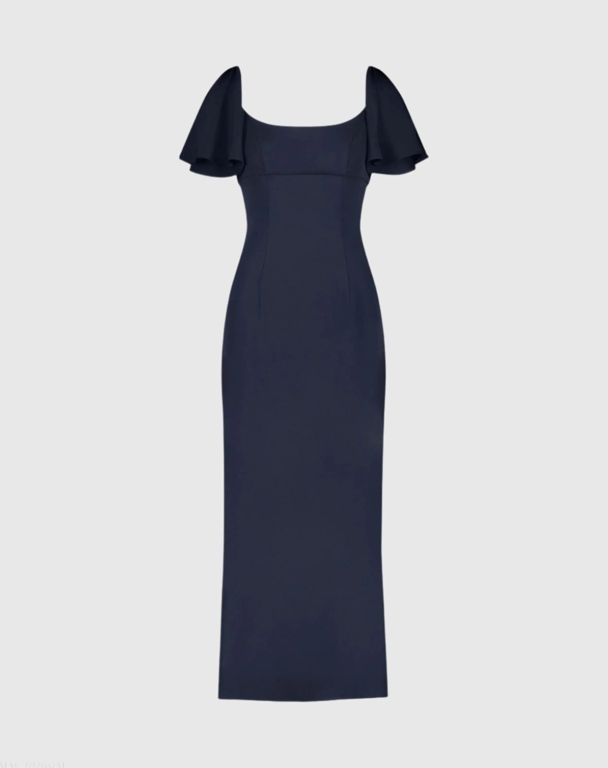 Perfect for wedding guests, our Crepe Fitted Dress with Short Ruffle Sleeves exudes elegance and charm. Designed for comfort and style, this dress features a sleek silhouette and delightful ruffle sleeves, making it in ideal work dress to to night events or special occasions.