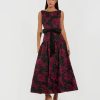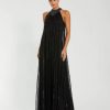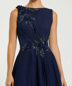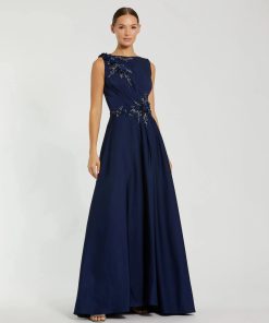 This sleeveless a-line gown boasts a boat neckline and an elegantly embellished bodice. Delicate floral details and a flowing silhouette make this gown a timeless and sophisticated choice for any special occasion.